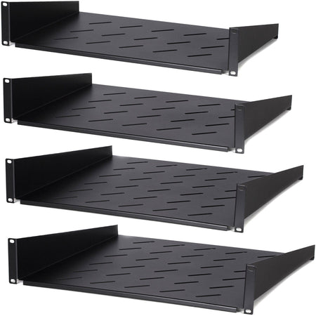 Diese Fachböden werden an den Front-Schienen deines Racks montiert und haben je nach Größe und Tiefe eine Tragkraft von einigen Kilogramm. Das genügt für alle Komponenten bis hin zu schweren Playern oder Stereo-Verstärkern. Je nach Gesamtgewicht tragen sie auch mehrere Geräte, die klassisch übereinander gestellt werden.